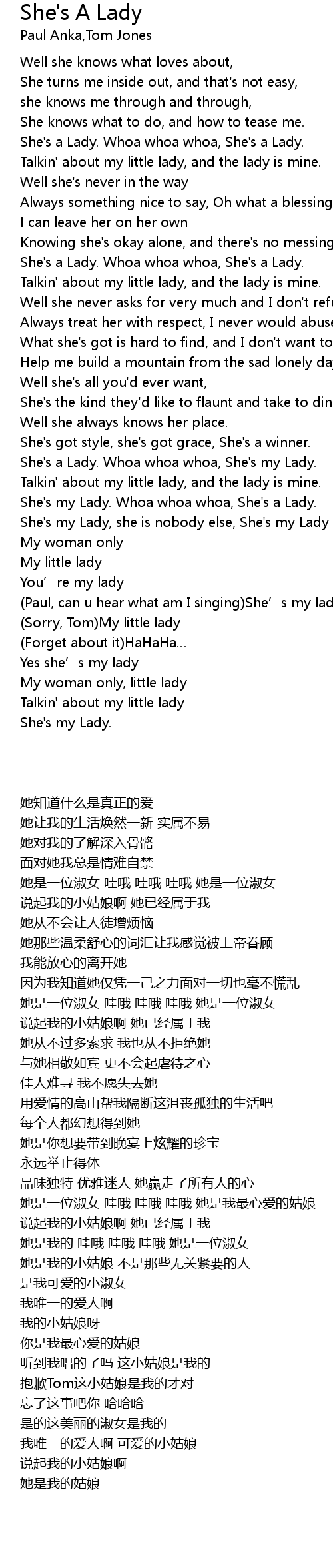 | [01:28.490] | She' s a Lady. Whoa whoa whoa, She' s a Lady. |