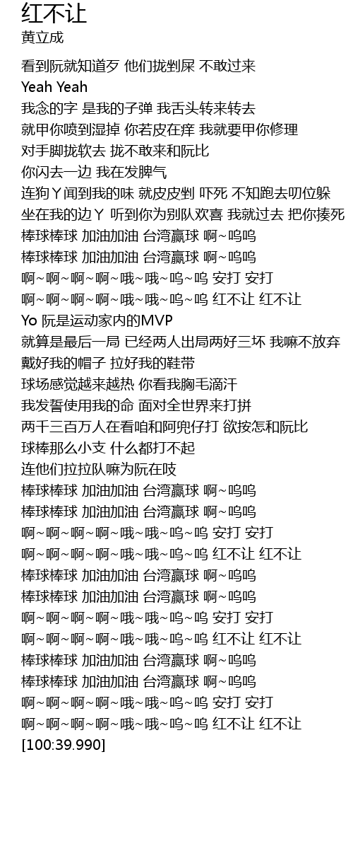 | [01:37.570] | 棒球棒球 加油加油 台湾赢球 啊~呜呜 |