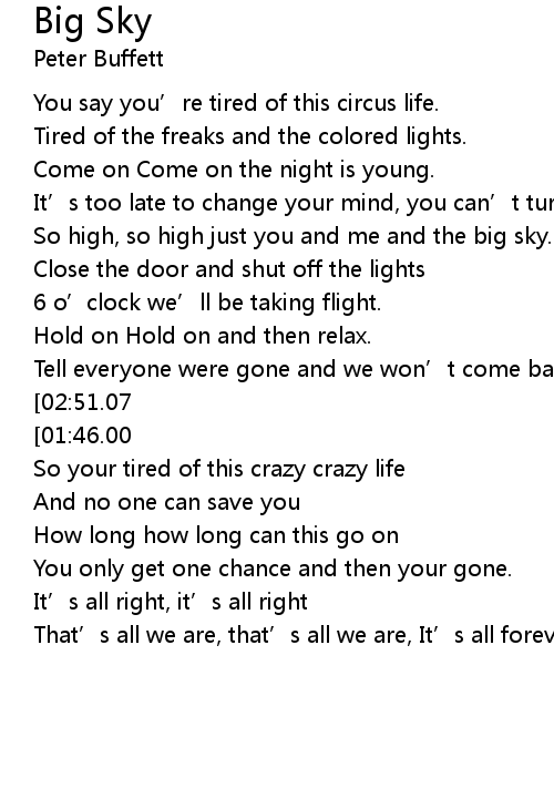 | [02:59.72][02:51.07][01:36.05] | So high just you and me and the big sky |