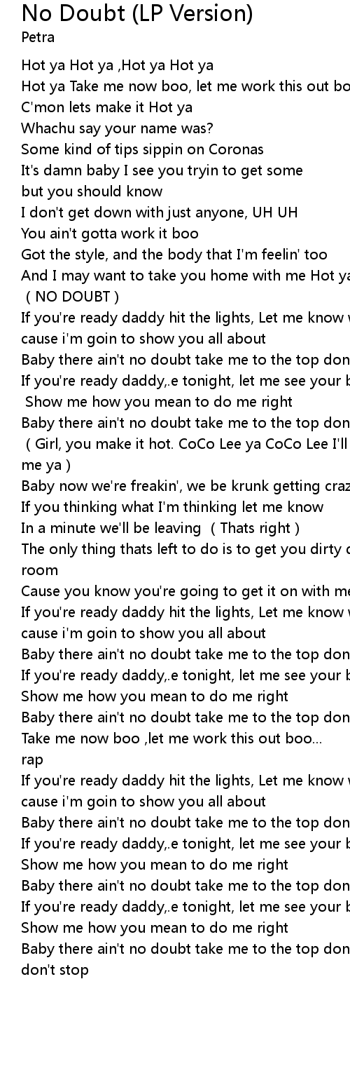 | [00:36.57]And I may want to take you home with me Hot ya (NO DOUBT] | )tonight (NO DOUBT) |
