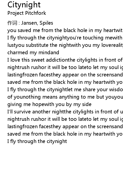 | I love this sweet addictionthe citylights in front of usare gleaming in the nightrush rushor it will be too lateto let my soul ignitestrangers passingnever lastingfrozen facesthey appear on the screensand they don't tell me anythingyou saved me from the black hole in my heartwith you by my side | |