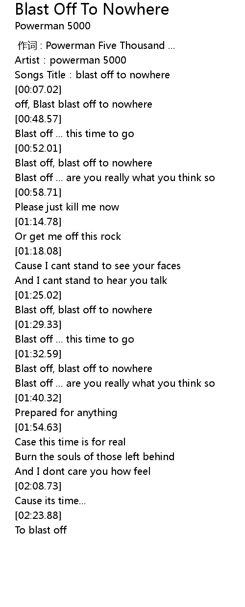 | [00:03.46] | Songs Title: blast off to nowhere |