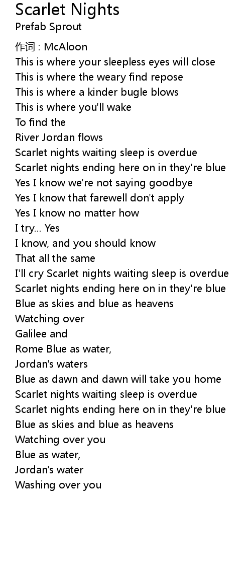 | Scarlet nights ending here on in they' re blue | |