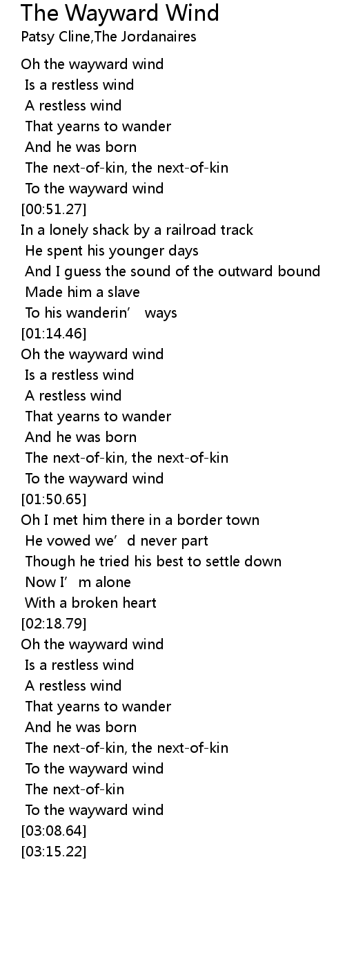 | [02:19.74] | Oh the wayward wind |