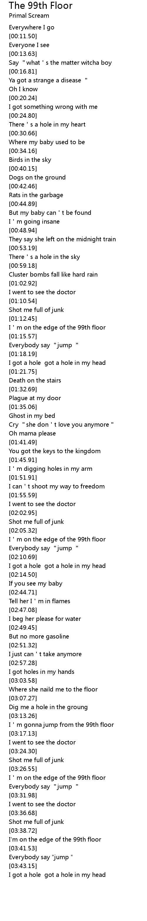 | [03:27.79] | I'm on the edge of the 99th floor |