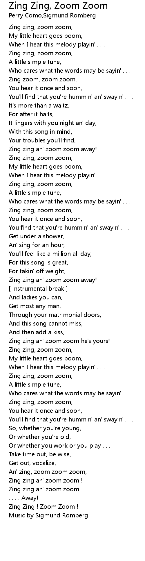 | Zing zing, zoom zoom, | |