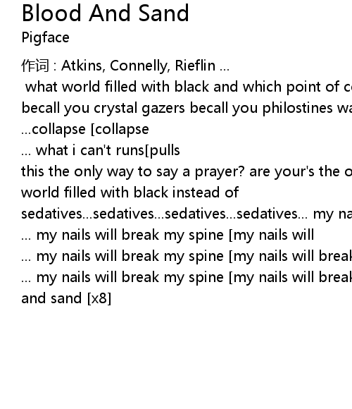 | blood and sand [x4] what world filled with black and which point of collapse becall you crystal gazers becall you philostines water melting decayed and angry collapse [collapse]...collapse [collapse]... collapse [collapse]...collapse [collapse]... what i can't runs[pulls] my fingers from the burning metal sign is this the only way to say a prayer? are your's the only eyes that stare? what world filled with black instead of sedatives...sedatives...sedatives...sedatives... my nails will break my spine [my nails will break my spine]... my nails will break my spine [my nails will break my spine]... my nails will break my spine [my nails will break my spine]... my nails will break my spine [my nails will break my spine]... blood and sand [x8] |