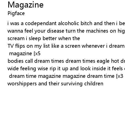 | TV flips on my list like a screen whenever i dream it's all magazine it's all magazine [x5] magazine [x5] dream time time most real of all luminous faces bodies call dream times dream times eagle hot dream time embrace a dot will so wide feeling wise rip it up and look inside it feels empty it's just me dream time [x3] dream time magazine magazine dream time [x3] magazine satan worshippers and their surviving children |
