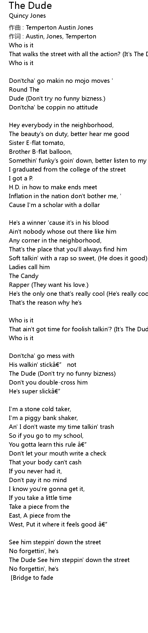 | The Dude [Repeat Verse 1] [Bridge to fade] |
