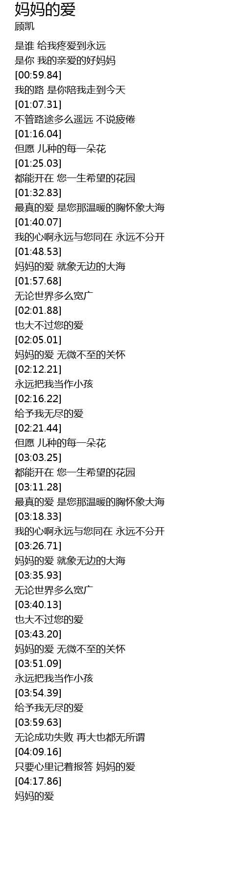 | [04:10.97] | 只要心里记着报答 妈妈的爱 |