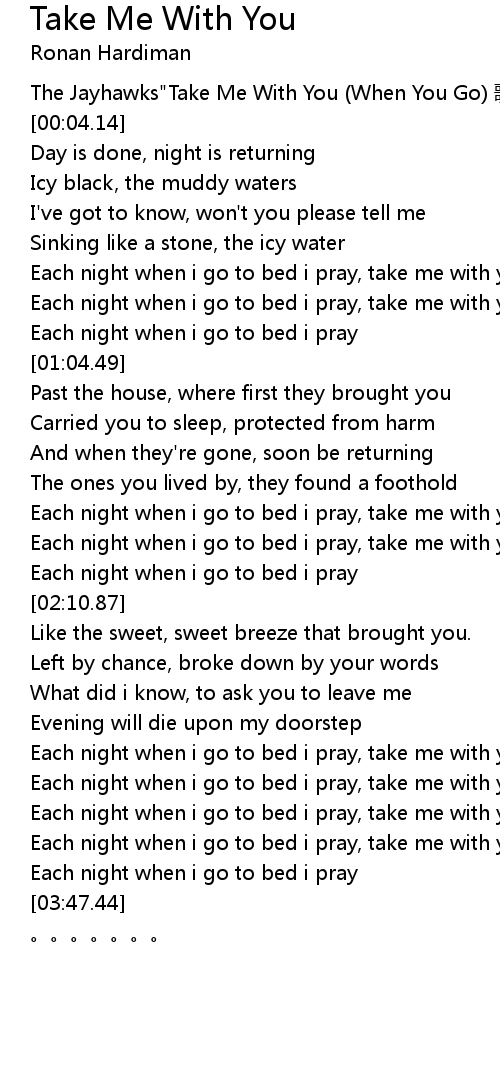 | [03:12.69] | Each night when i go to bed i pray, take me with you when you go |
