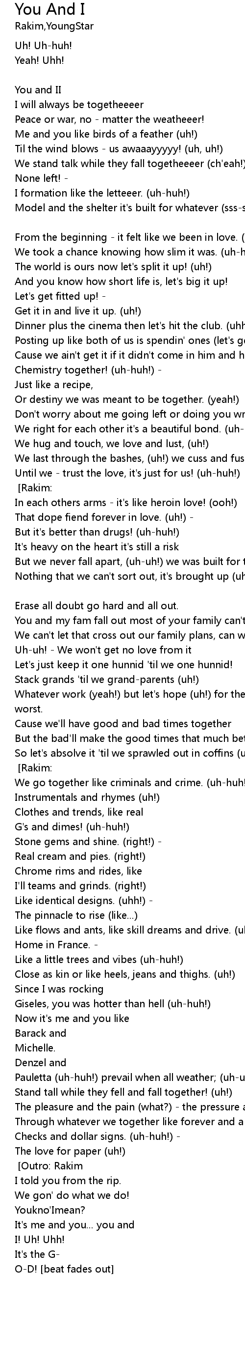 | Better yet - like father time and mother nature! [Chorus] [Outro: Rakim] | |