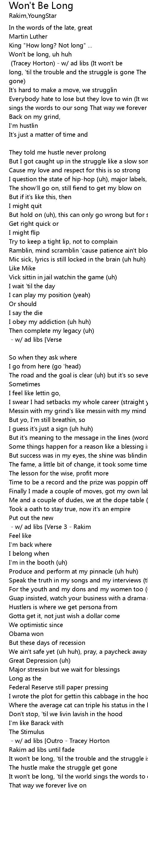 | Uh, uh Sing along [Chorus - Rakim] (Tracey Horton) - w/ ad libs (It won't be long, 'til the trouble and the struggle is gone The hustle make the struggle get gone) | |