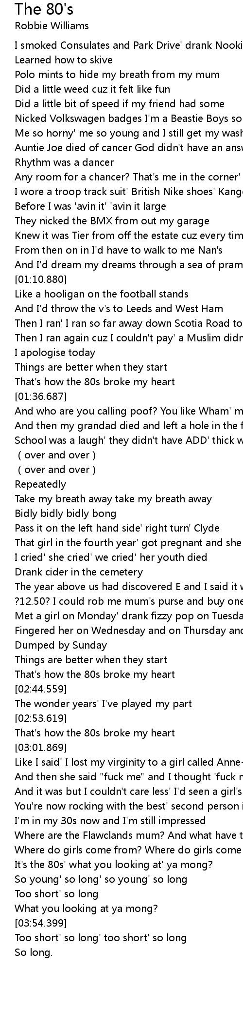 | [00:33.378] | Nicked Volkswagen badges I' m a Beastie Boys son |