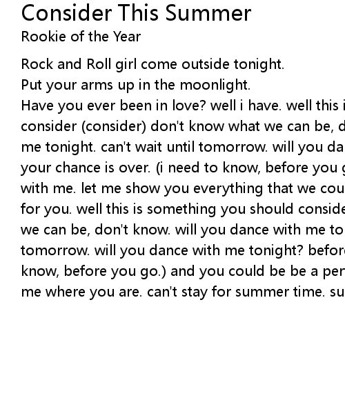 Have you ever been in love? well i have. well this is something you should consider (consider) don't know what we can be, don't know. will you dance with me tonight. can't wait until tomorrow. will you dance with me tonight? before your chance is over. (i need to know, before you go.) rock and roll girl runaway with me. let me show you everything that we could be. by the way this song is for you. well this is something you should consider (consider) don't know what we can be, don't know. will you dance with me tonight. can't wait until tomorrow. will you dance with me tonight? before your chance is over. (i need to know, before you go.) and you could be be a perfect star to hold me, just tell me where you are. can't stay for summer time. summer... |