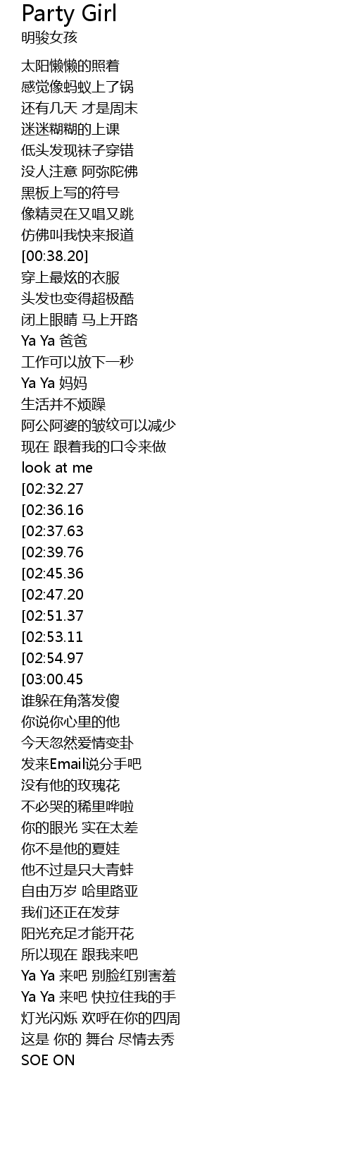 | [03:36.74][02:47.20][01:16.30] | BA BA BABY tiao yi tiao xiao yi xiao BABY |