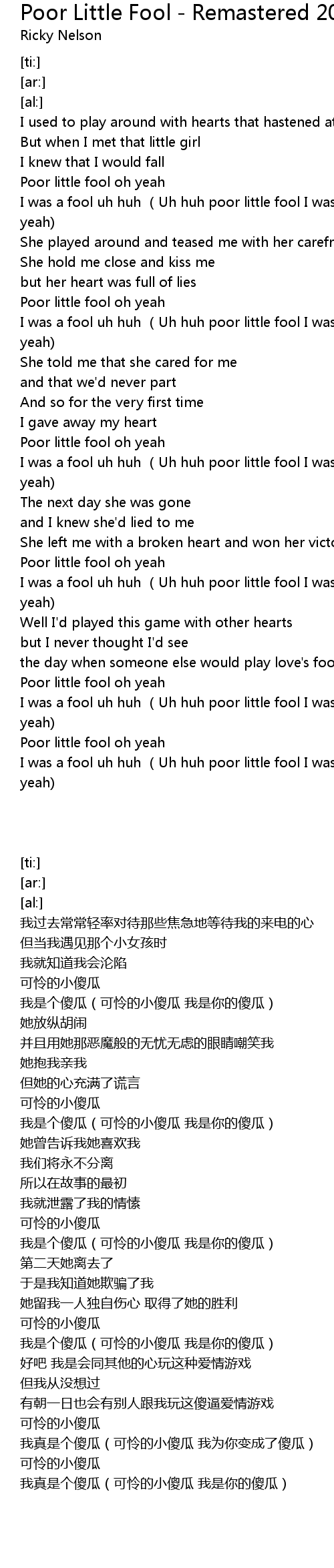 | [01:17.33] | I was a fool uh huh (Uh huh poor little fool I was your fool oh yeah) |