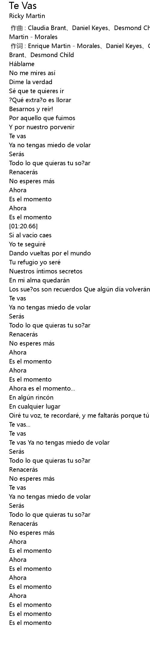 | [00:01.00] | 作词 : Enrique Martin - Morales、Daniel Keyes、Claudia Brant、Desmond Child |