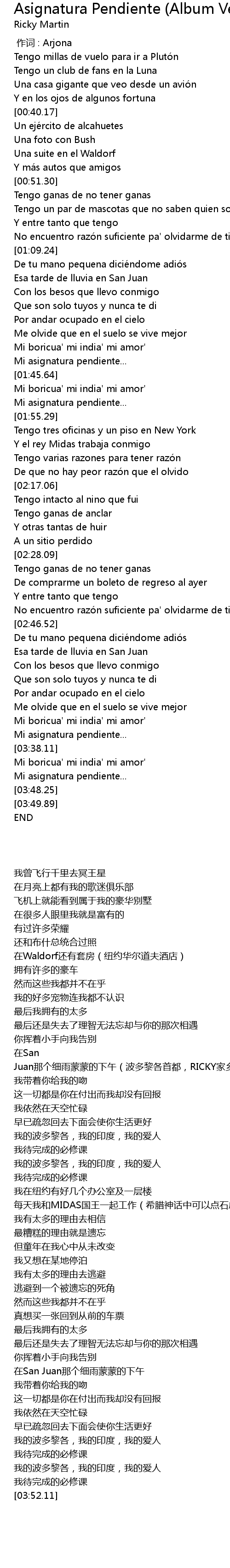 | [03:30.19] | Mi boricua' mi india' mi amor' |