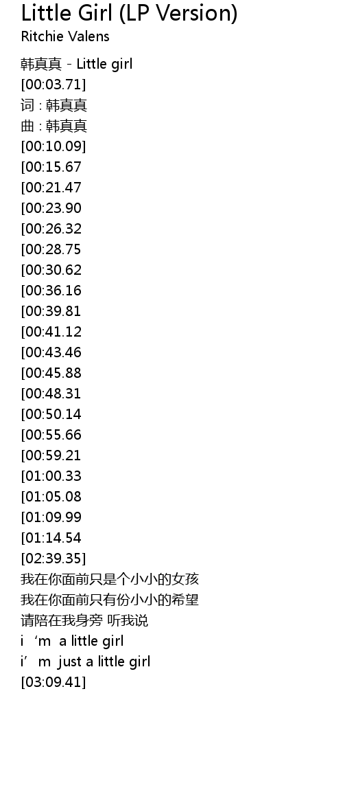 | [02:15.24][00:55.66] | i' m just a little girl |