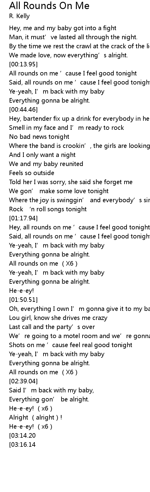 | [01:18.43] | Hey, all rounds on me ' cause I feel good tonight |