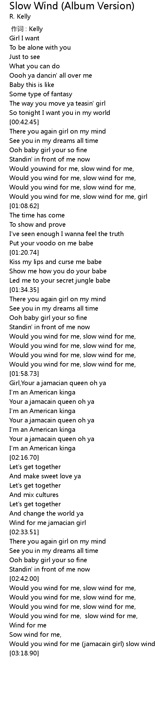 | [03:02.59] | Would you wind for me jamacain girl slow wind for me |