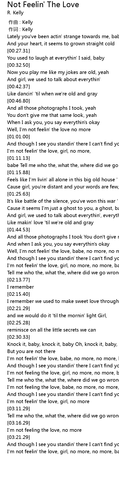 | [00:56.74] | Well, I'm not feelin' the love no more |