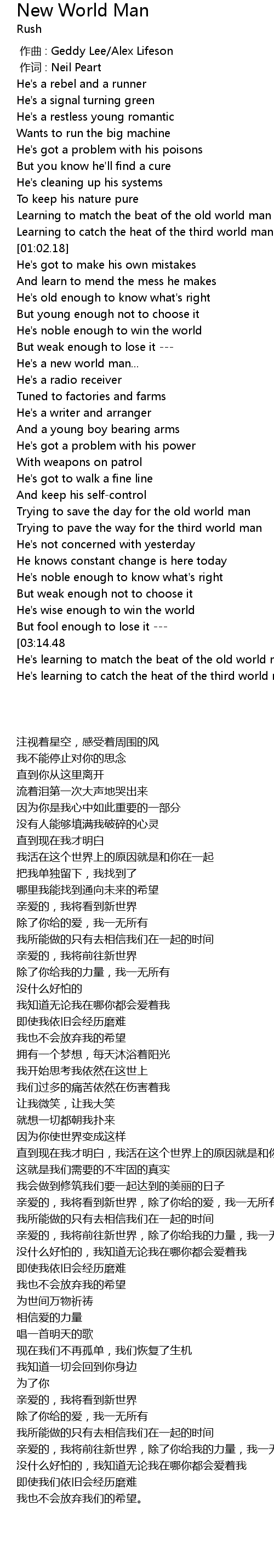 | [03:20.20][03:14.48][02:46.36] | He' s a new world man |