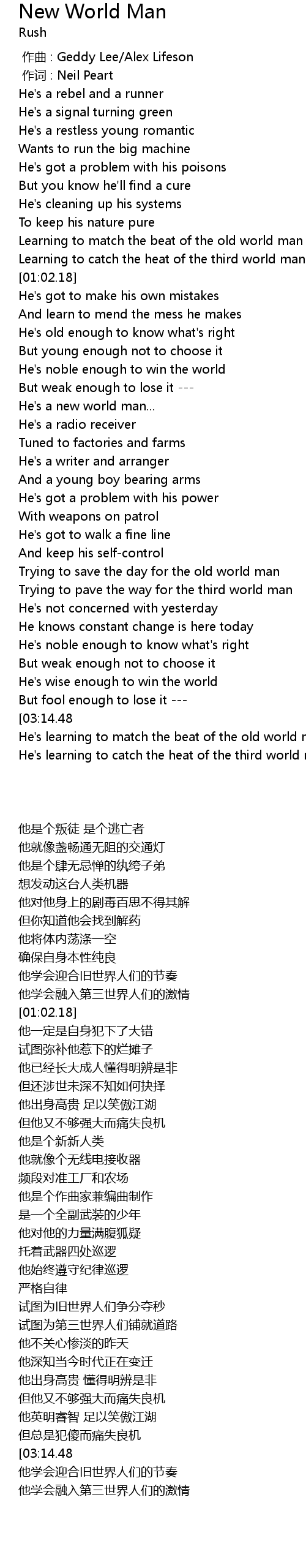 | [03:20.20][03:14.48][02:46.36] | He' s a new world man |