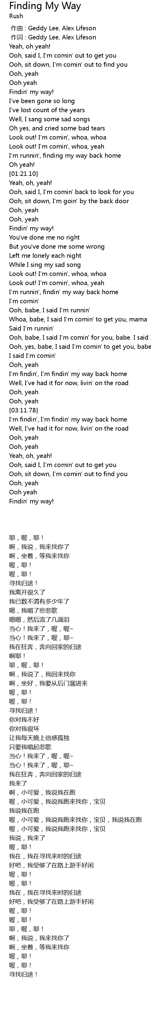 | [00:01.00] | zuo ci : Geddy Lee, Alex Lifeson |
