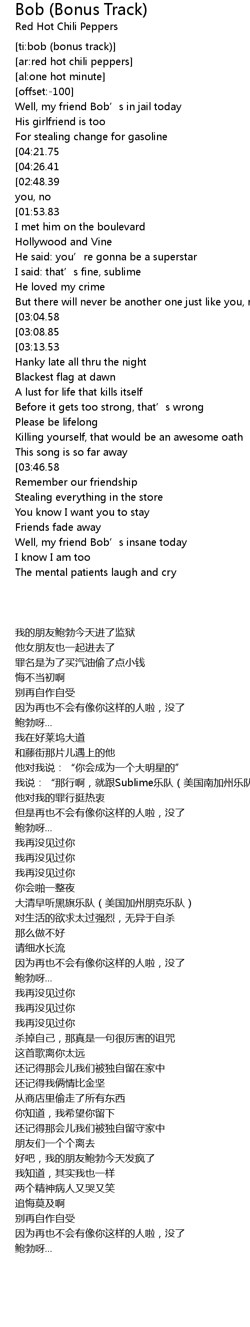| [00:45.64] | Well, my friend Bob' s in jail today |