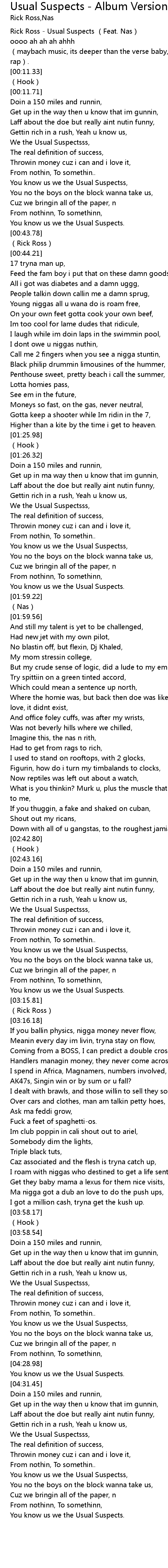 | [00:00.00] | Rick Ross - Usual Suspects (Feat. Nas) |