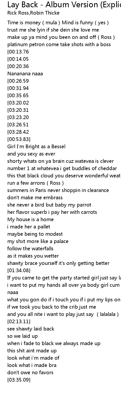 | [00:38.89][03:20.31][01:59.70] | Just Take off ya clothes and just lay back |