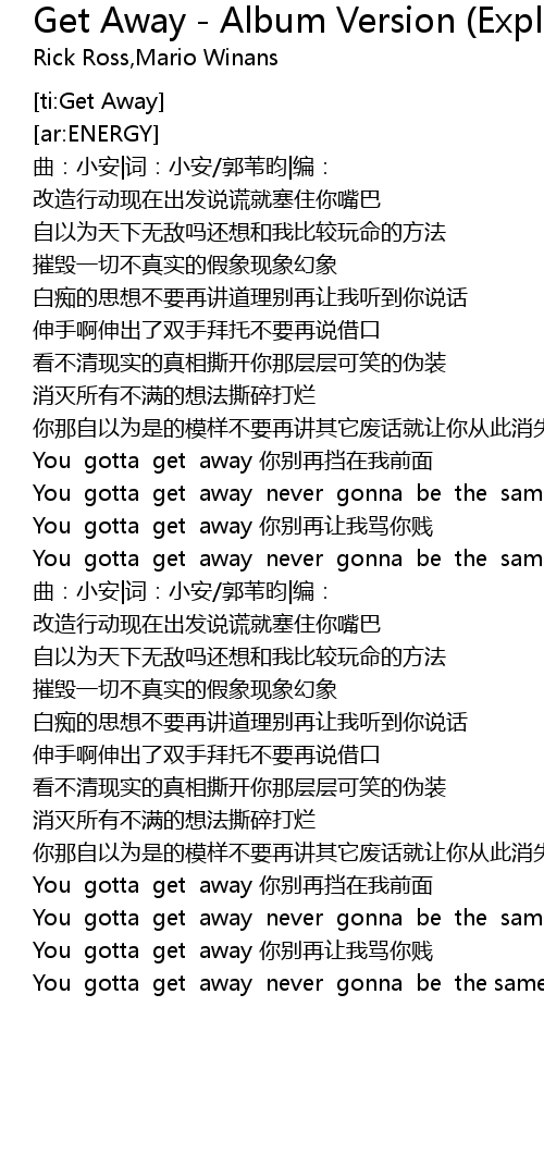 | [01:19.329] | You gotta get away ni bie zai rang wo ma ni jian |
