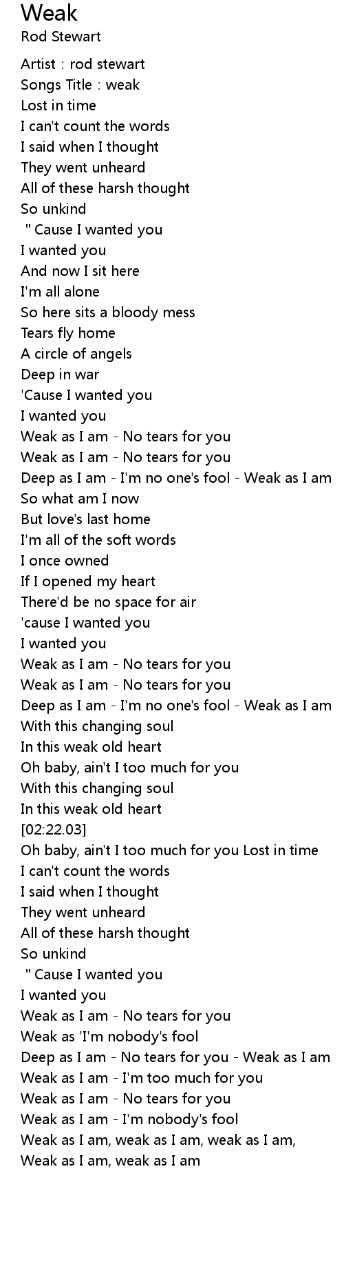 | [01:15.27] | Deep as I am - I'm no one's fool - Weak as I am |