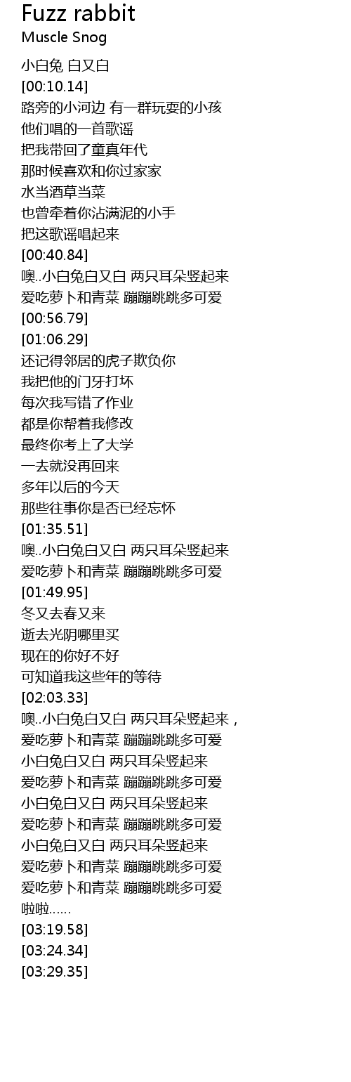 | [02:03.53] | ō.. xiǎo bái tù bái yòu bái liǎng zhǐ ěr duǒ shù qǐ lái, |
