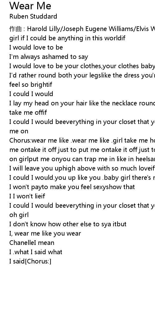 | Chorus: wear me like . wear me like . girl take me home andtake it off just to put me ontake it off just to put me ontake it off just to put me onput me on, put me on girlput me onyou can trap me in like in heelsand | |