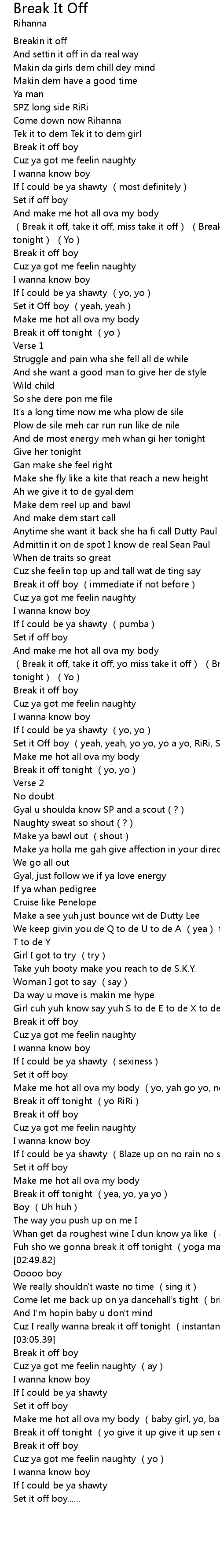 | [01:22.78] | (Break it off, take it off, yo miss take it off) (Break it off tonight) (Yo) |