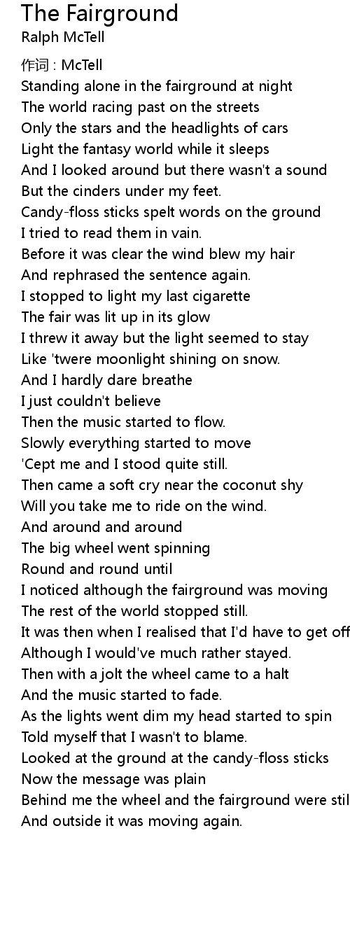 | Behind me the wheel and the fairground were still | |