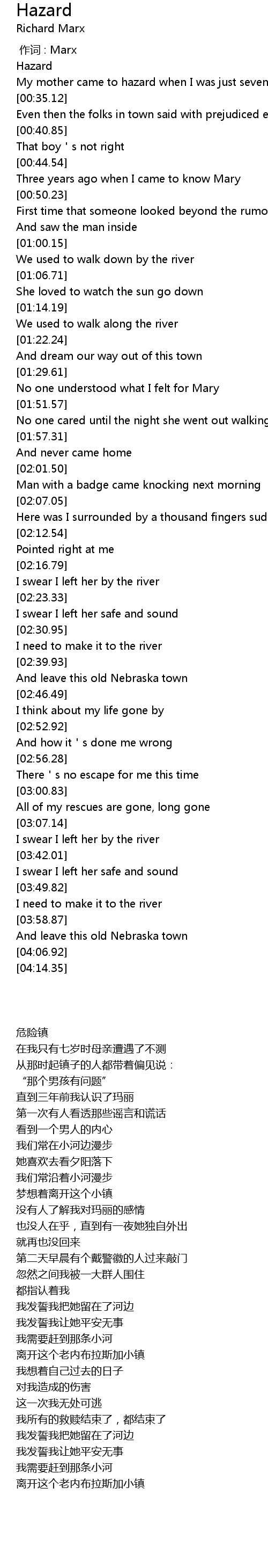 | [00:31.43] | My mother came to hazard when I was just seven |
