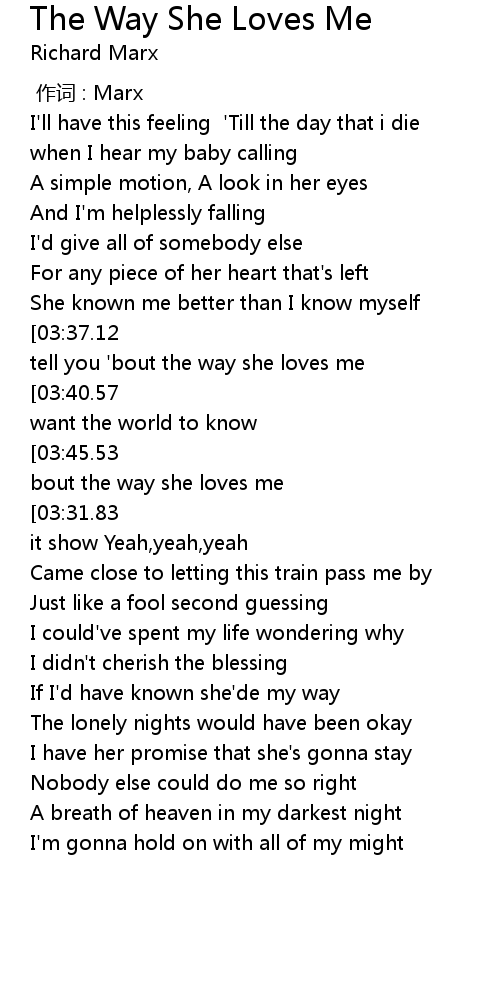 | [03:54.23][03:37.12][03:19.81][03:02.65][02:04.79][01:09.13][00:01.42] | Let me tell you 'bout the way she loves me |