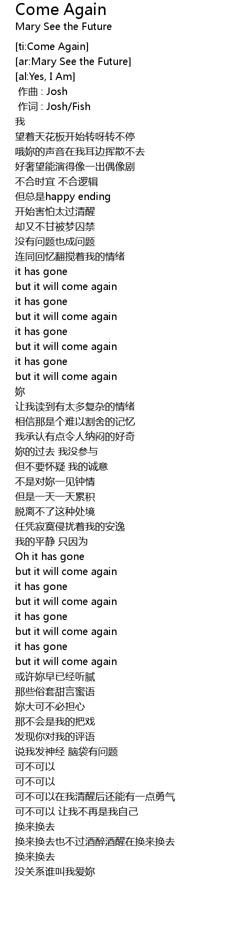 | [00:01.00] | 作词 : Josh/Fish |