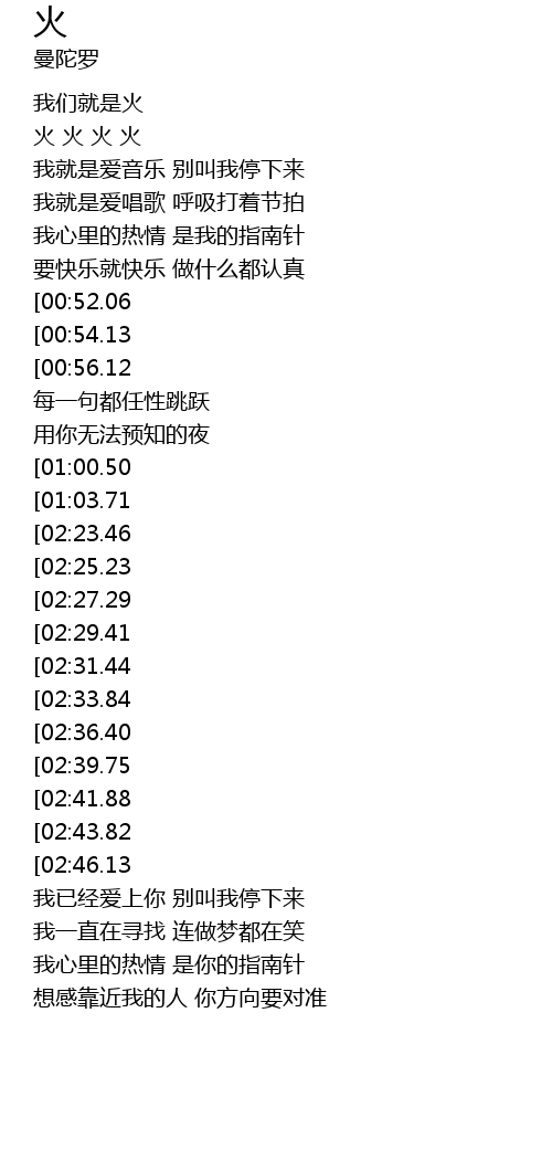 | [02:52.29][02:43.82][01:29.11] | ài qíng jiù shì huǒ |