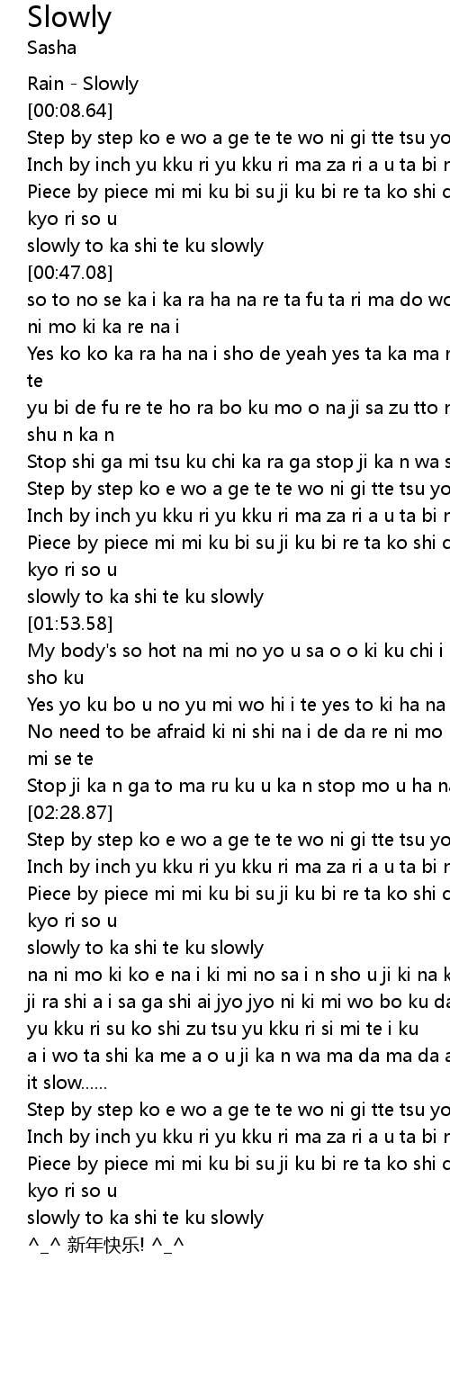 | [01:47.90] | slowly to ka shi te ku slowly |