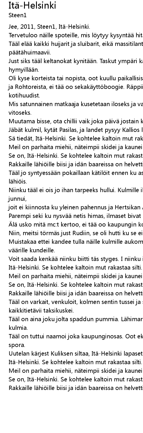 | Sä tiedät, Itä-Helsinki. Se kohtelee kaltoin mut rakastaa silti. | |