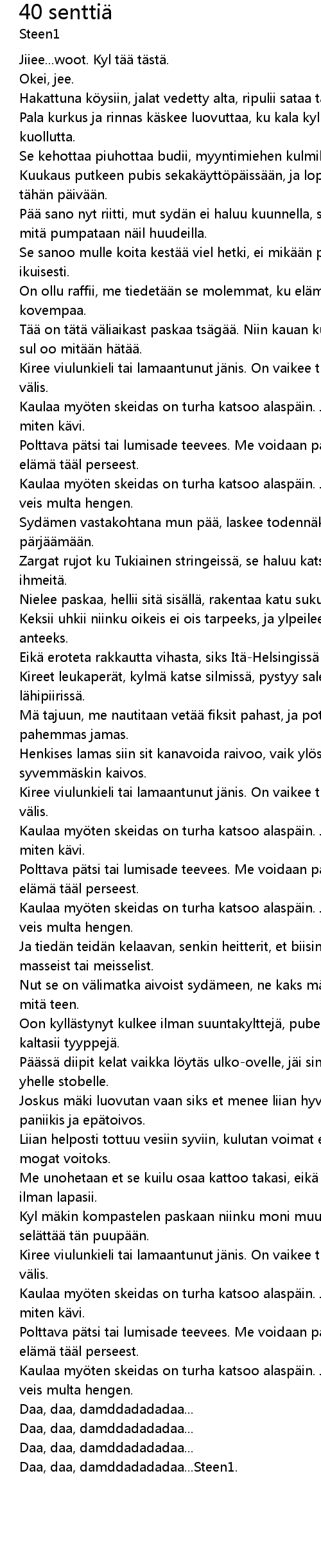 | Pää sano nyt riitti, mut sydän ei haluu kuunnella, se haluu tehä biittei mitä pumpataan näil huudeilla. | |