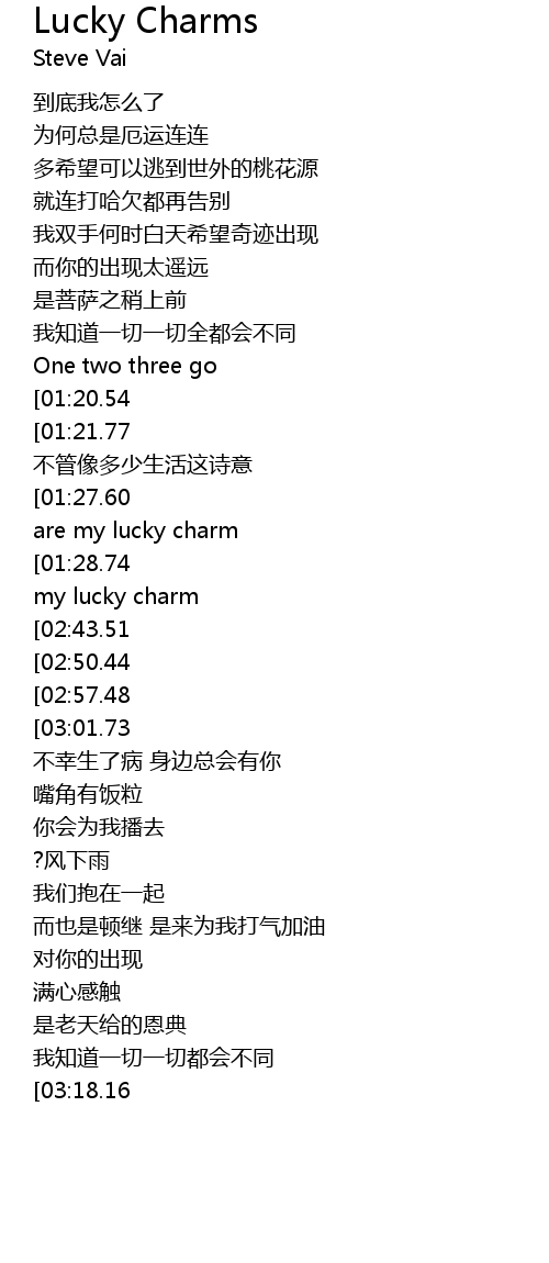 | [01:15.00][01:28.74][02:34.83][02:48.72][02:55.76][03:16.60][03:30.58][03:37.34] | you're my lucky charm |