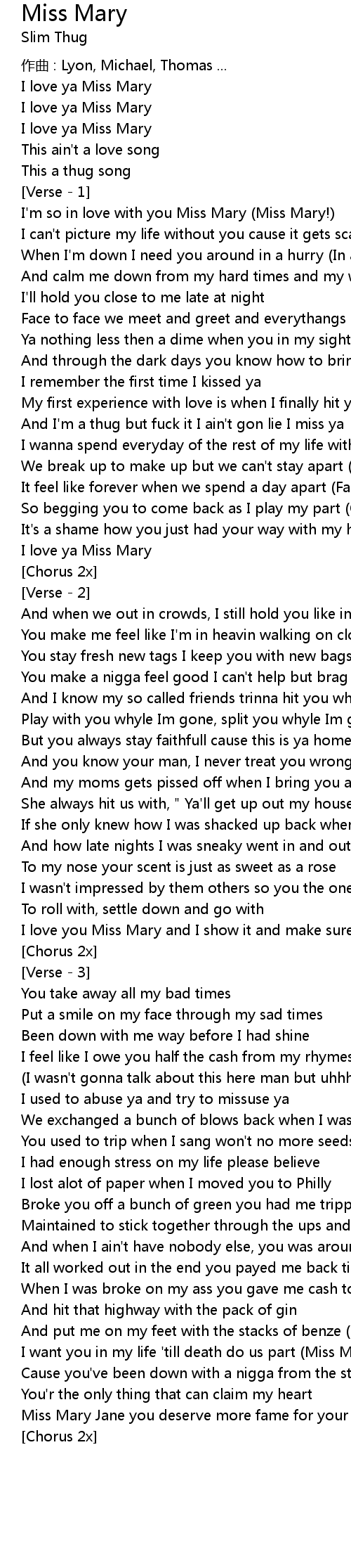 | Cause you' ve been down with a nigga from the start Miss Mary | |