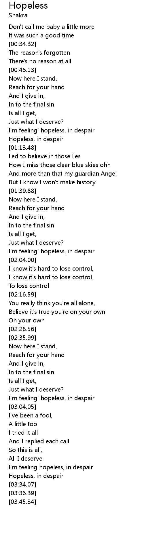 | [02:59.17] | I'm feeling' hopeless, in despair |