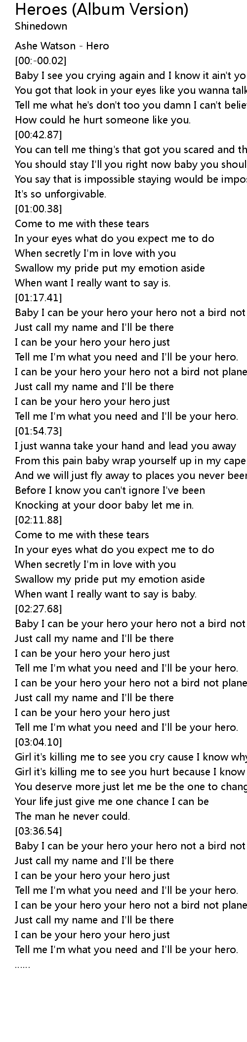 | [01:17.58] | Baby I can be your hero your hero not a bird not plane |